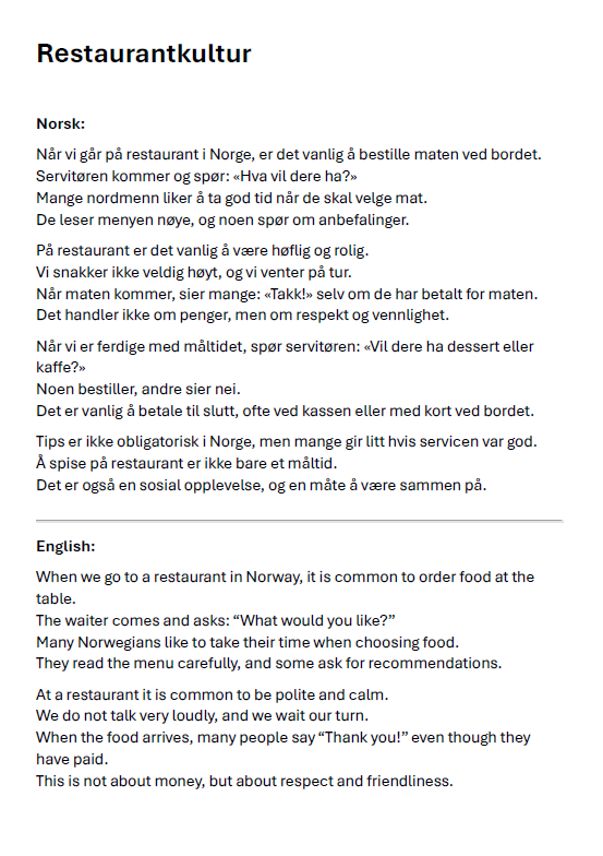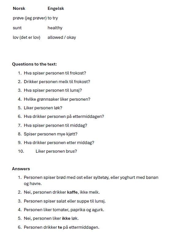This booklet is a complete learning resource for anyone studying Norwegian on levels A1–B2. The theme is food (“mat”), and the content is designed to help learners build real vocabulary, understand everyday Norwegian, and practice reading skills at several levels.